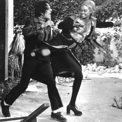 Speaking of cinematic, Dobson's fashions - designed mostly by the lady herself - must also be mentioned...though this fashion challenged movie blogger is going to let another writer describe the clothing on display...I'm not saying where I got it from...but it starts with a W and ends edia...."rich reds and yellows, tailored pantsuits, clinging silk shirts, voluptuous fur jackets, turbans, silk headdresses, and hooded capes." They are amazing, and Dobson wears them all with panache. My favorite is a kind of three toned bathrobe dress, split to the bellybutton, with Dobson in red nylons and platform heels - the actress cuts quite a figure in this outfit, and it gets well nigh incredible when those long legs come flashing out in kung fu kicks.